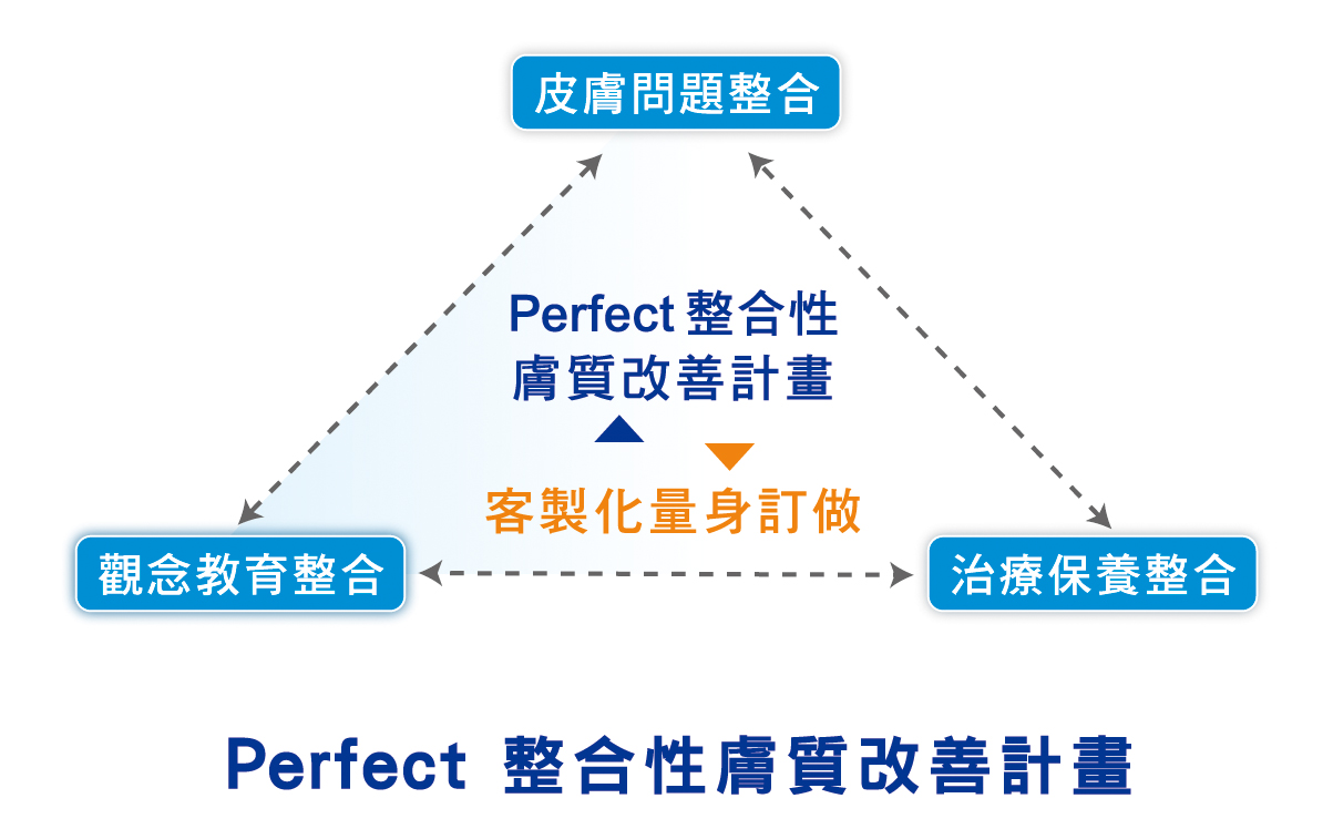 廖醫師提醒愛美的民眾,皮膚藥品、醫學美容、居家保養,三者需整合式的搭配使用,相輔相成之下,就可以讓肌膚維持在一個良好的狀態,也就是自己所提倡的「Perfect 整合性膚質改善計畫 ®」 。因此保養並不是有用就有保佑,而是要先了解自己的膚質、膚況,再選擇適合的保養品與醫美療程,懂得買、懂得用,才能算是有效保養。