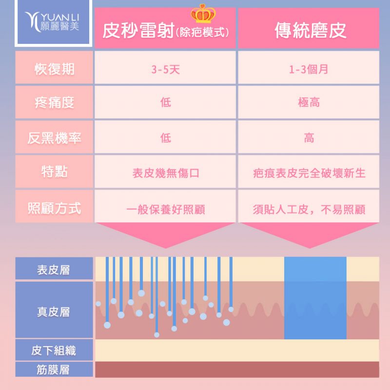 雖然磨皮雷射對於嚴重型痘疤有一定的效果,但是他的恢復期長、照顧不易,加上許多需要膚質感善的朋友,臉上的凹疤也沒有嚴重到需要整個經由磨皮雷射磨除,因此在治療上,皮秒雷射(痘疤模式)就佔了很大優勢!
