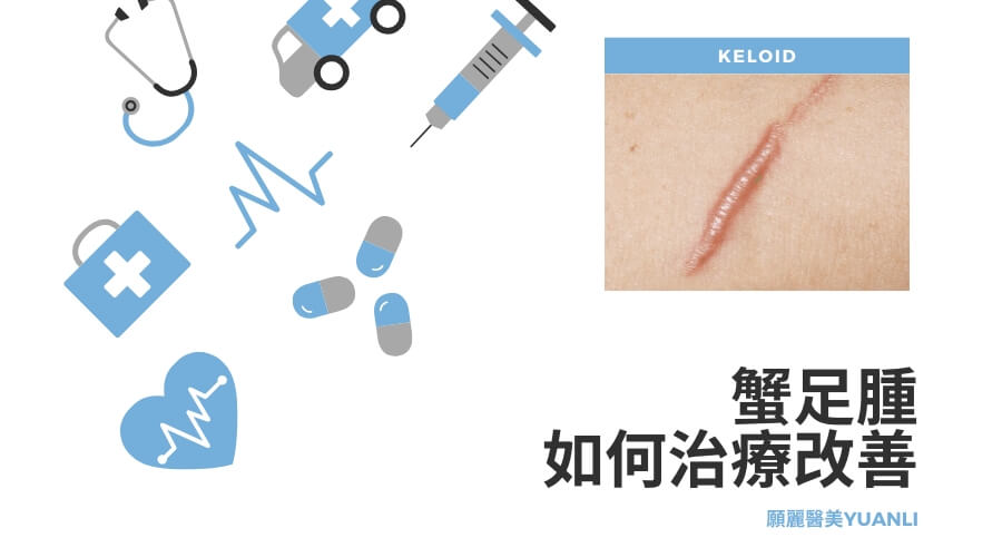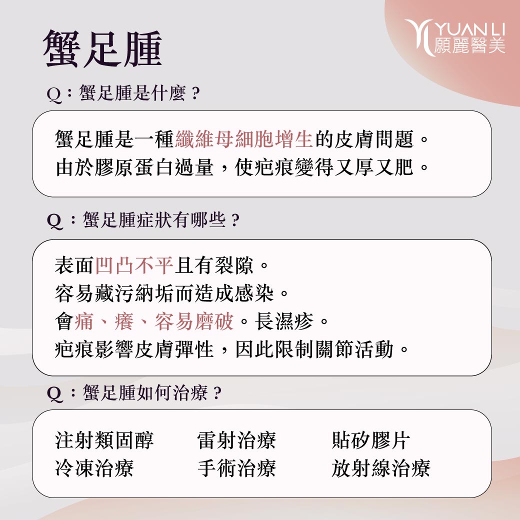 廖苑利醫師認為,目前治療蟹足腫的方式,以類固醇注射搭配藥膏或矽膠貼片為佳!蟹足腫疤痕平坦之後,仍然會有暗紅色的色疤,這個部份,如果還在意的話,可以打脈衝光來淡化色澤。