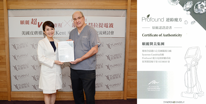 願麗醫美診所取得Profound 魔方電波除皺原廠專業認證證書及獎盃,設備皆來自於美國原廠Syneron Candela,在醫療環境、儀器設備、醫師技術上講究細節與品質。