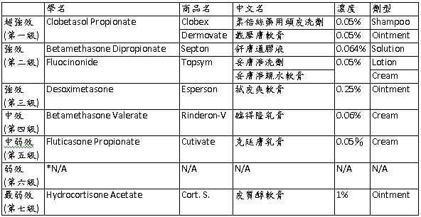 強效的外用類固醇,用於治療頑固皮膚炎症和斑塊狀牛皮癬。超強效的外用類固醇,用於治療強效類固醇無法處理的頑固皮膚炎症,但是一般不建議連續外用超過三星期。