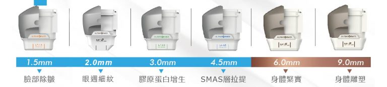 第三代海芙音波拉提擁有獨特專利技術MMFU鉑金探頭,目前共有6種深度,
