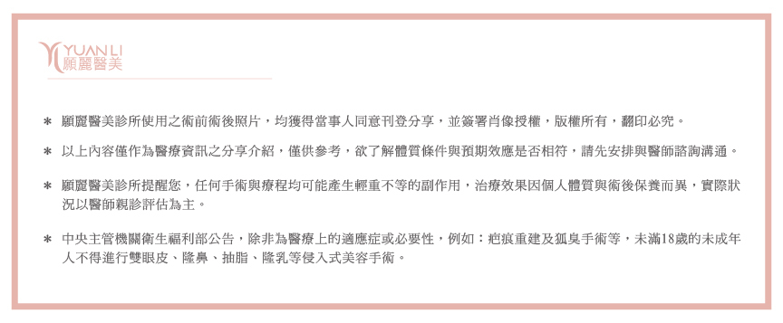 願麗醫美貼心小叮嚀: 任何手術與療程皆有可能產生輕重不等之副作用,並非適合所有人,本文內容僅供參考,實際狀況將由醫師當面進行評估溝通,願麗醫美團隊會依照個人狀況而有不同建議,為您量身訂作客製化療程。