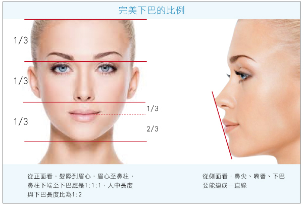 依照人體美學的黃金比例,下巴長度應占全臉長度了六分之一,或是雙唇閉合後,雙唇厚度的1.6倍,從側面看,下巴最下緣位置應與眉心在同一條垂直線上。女性適合小巧精緻的V型下巴,男性多以寬厚的U型線條展現堅毅的性格為主。