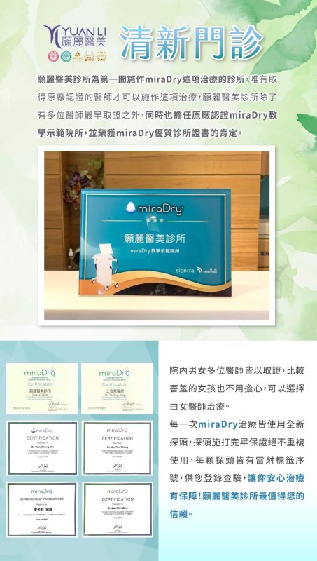 MiraDry清新微波,經美國FDA、歐盟CE、台灣衛福部,核准使用於腋下治療多汗症之儀器,核准字號為:衛部醫器輸字第025955號,民眾經專科醫師診斷後可放心治療。