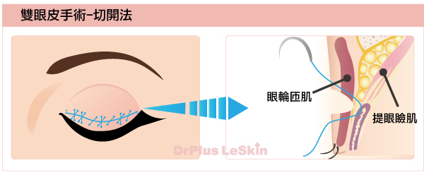 結合縫合法與切割法的優點,將雙眼皮摺線處切開,將多餘皮之割取,再將提眼瞼肌上之肌膜縫合。