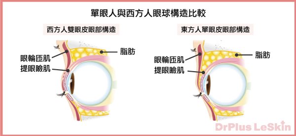 東方人與西方人眼球構造不同,以致東方單眼皮及西方雙眼皮的差異。 東方人眼睛較突出,眼窩脂肪較多、皮膚肌肉較厚、提眼瞼肌與肌肉不相連,當眼皮肌肉張開時,只提起眼窩中隔與脂肪,眼皮仍呈平滑的外觀,以致單眼皮與內雙眼皮,有許多單眼皮外眼角上揚形成鳳眼,多數人合併泡泡眼情形。