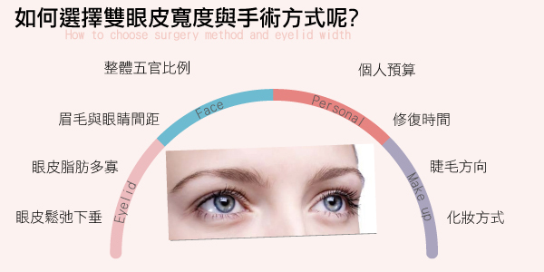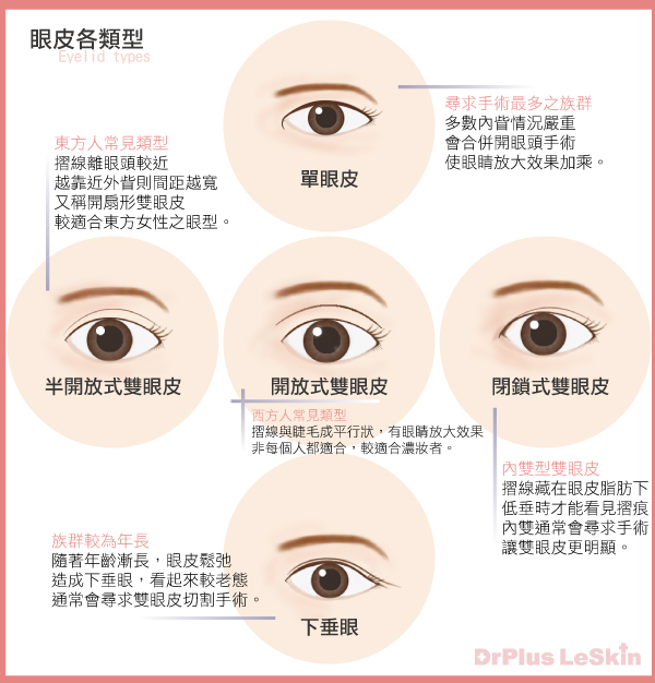 不同類型眼皮會影響眼神及眼睛放大效果,不同臉型適合的雙眼皮也不同,除了上述雙眼皮類型外還有大小眼、下垂眼、泡泡眼、單眼皮等。