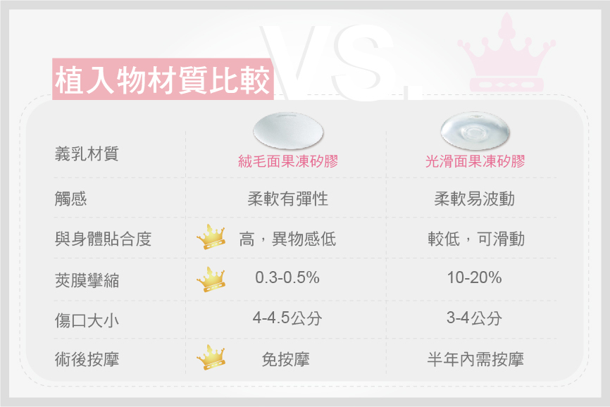 果凍矽膠義乳外膜的材質分有「光滑面」以及「絨毛面」,其中絨毛面果凍矽膠不用按摩,且莢膜攣縮的發生率極低,就術後的照護便利性來說,非常適合忙碌的現代女性。