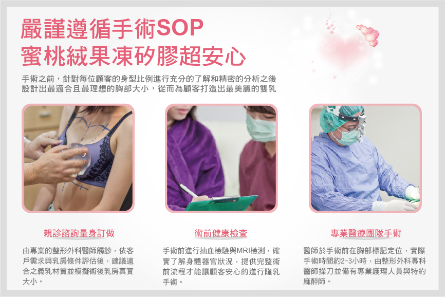 果凍矽膠隆乳手術時間約需2-3小時,由專業的整形外科醫師操刀,並備有專業護理人員與特約麻醉師。