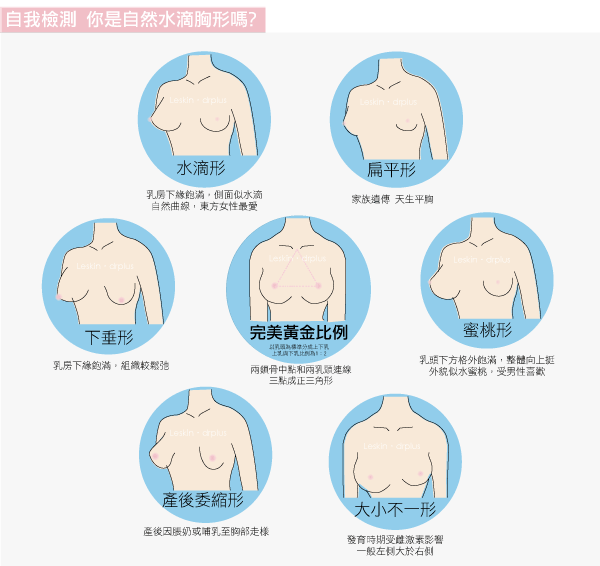 完美胸形的黃金比例為乳頭的位置坐落於肩膀及手肘的中間,兩鎖骨中點和兩乳頭連線,三點可以構出一個正三角形,乳房從側面看會呈現水滴形。以乳頭為標準分成上下乳,上乳與下乳比例為1:2。乳房的形狀決定手術的方向,你是屬於哪一種胸形呢?