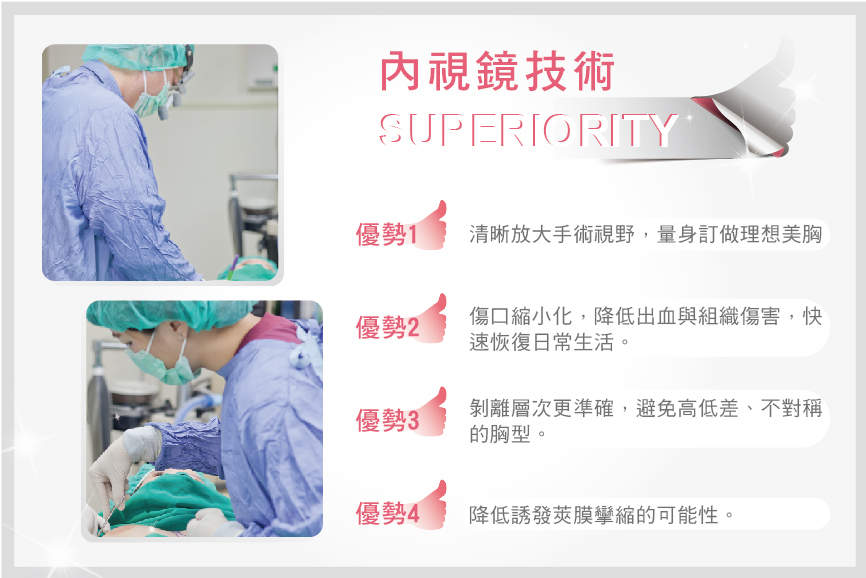 A:傳統的隆乳手術有義乳破裂、細菌感染、義乳外漏、兩側不對稱、莢膜攣縮發生率較大等風險,使用內視鏡隆乳再修復過程中易於更換義乳,準確地進行剝離,並減少誘發不對稱的可能性