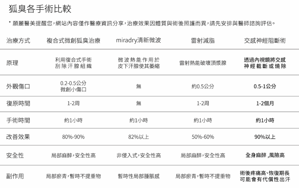 | 狐臭 | 原發性 | 大汗腺 (頂漿腺) | 腋下、陰部 乳頭、肚臍 耳道等 | 低 | 複合式微創手術 雷射減脂 微波熱能除汗 |