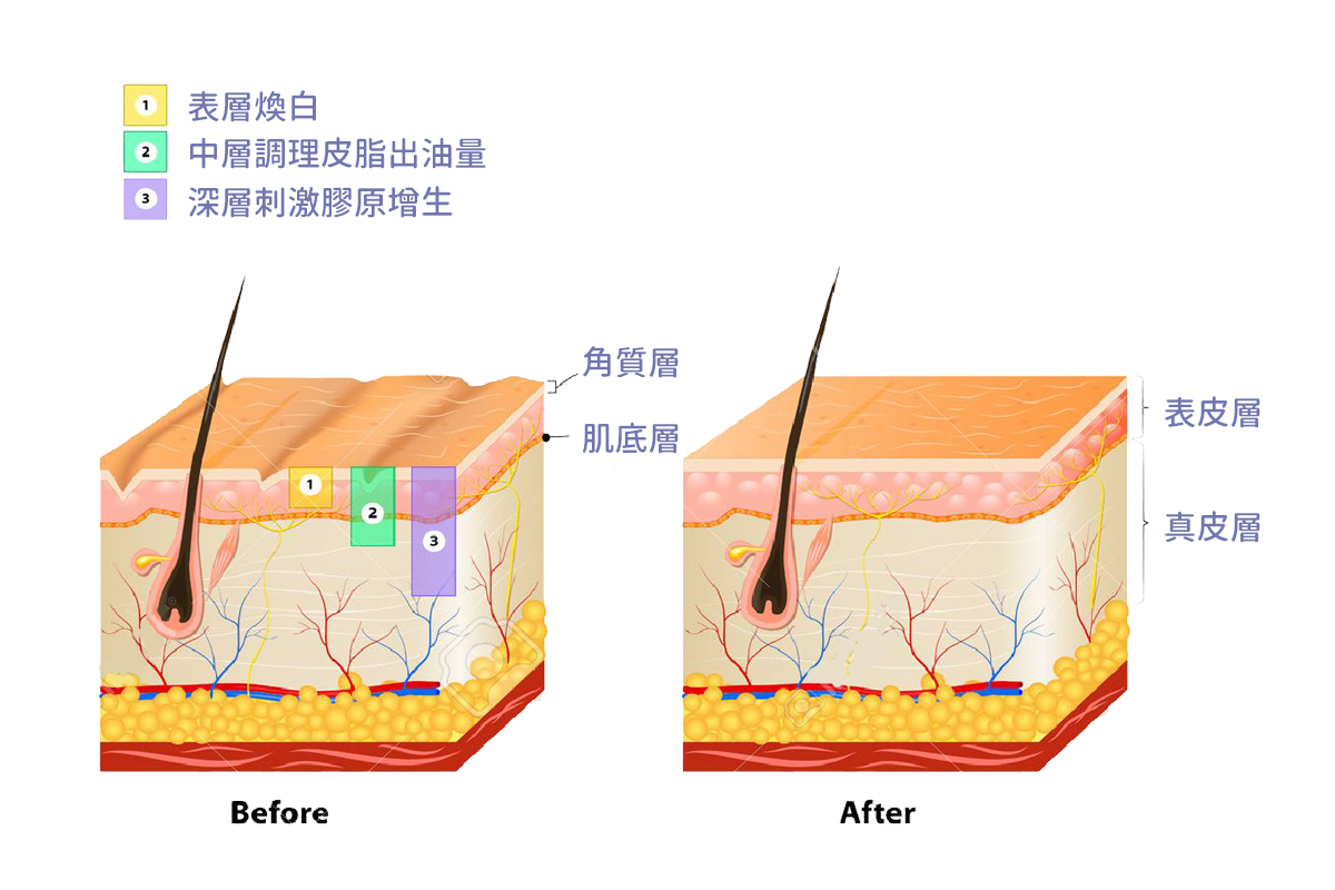 2.煥膚後一週內,避免蒸臉、日光浴、擠粉刺、去角質、剝除脫皮、並暫停使用含果酸及A酸類保養品或藥物。