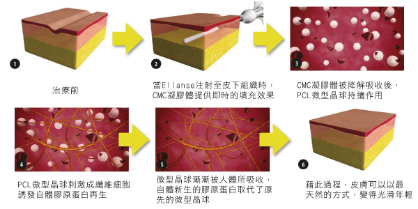 與一般填充物單一特性不同,Ellanse洢蓮絲是由CMC凝膠體(生物降解材料)與PCL微型晶球(聚己內酯)所組成,注入皮下組織後,提供即時修復、凹陷填充的效果,並持續刺激自體膠原蛋白增生,撫平皺紋、拉提肌膚,臨床實驗效果長達兩年以上。