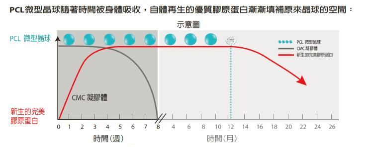 微晶球將隨者注入的凝膠均勻地分佈在皮下組織內的3D空間裡,搭建一個幫助皮膚重新生長自體膠原蛋白的支架。平滑、正圓形的完美球體以類3D列印方式,進行皮膚組織再造工程,晶球的平滑面輕柔地與組織接觸,微微的刺激組織生長出全新優質的膠原蛋白。