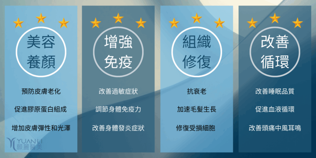 可做為保健抗衰老的預防醫療來或是改善體質的輔助治療,都有很好的效果。