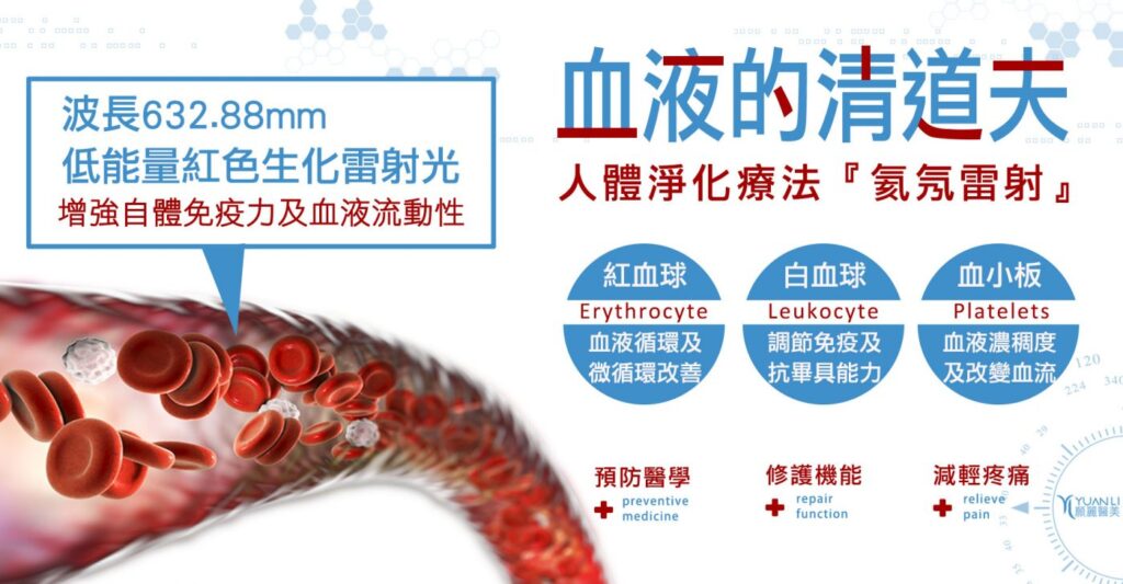 氦氖(淨血雷射)是利用光纖將低能量的雷射導入血液後,光能會轉化成生物能量,使紅血球的攜氧 能力增加,新陳代謝會增強,白血球及免疫機能也會改善。