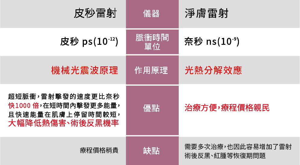 「皮秒」是一種時間單位,為10⁻¹²秒,「皮秒雷射」,比傳統的1淨膚雷射10⁻⁹奈秒快了1000倍。