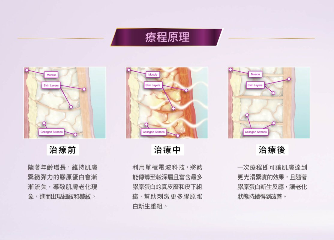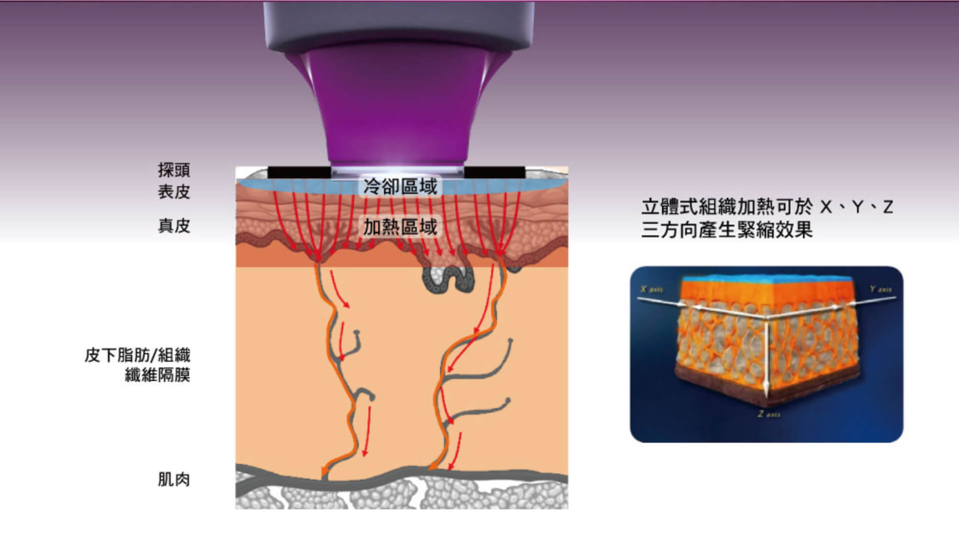 第四代 Thermage FLX鳳凰電波拉提的作用原理,是利用高頻率無線電波大範圍的「3D立體容積式加熱」,可更均勻精準向下作用至4.3mm的SMAS筋膜層進行全層加熱,由於FLX鳳凰電波溫度最高可達55℃,透過熱效應的作用可刺激膠原蛋白新生,有如鞏固水泥,是造成皮膚緊緻以及拉提作用的關鍵!